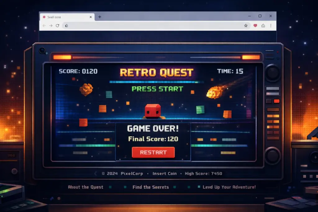 Create a single-page retro-inspired landing page that includes one fully playable mini game embedded directly...